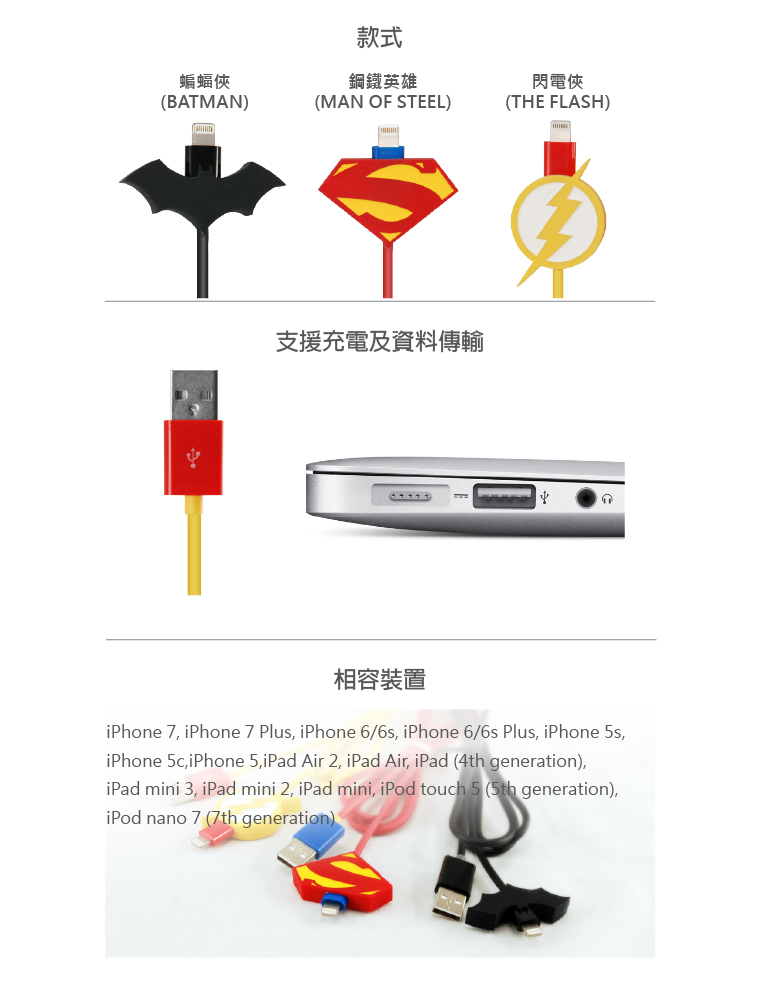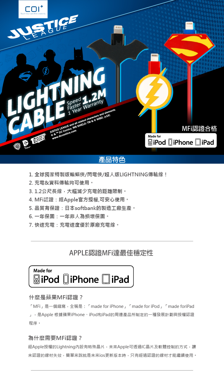 即將要隆重推出的DC正義聯盟《蝙蝠俠大戰超人》電影,Tim哥這次設計了全球獨一無二的DC正義聯盟系列Apple官方認證Lightning傳輸線了!是否可喜可賀!每款Lightning傳輸線均是台灣設計,外型顏色鮮艷搶眼,加上Lightning線頭的部分更有正義聯盟英雄的經典圖騰製成插頭,絕對適合入手一發收藏或作為日常使用啊!Tim哥也幫大家顧到了傳輸線的品質和傳輸速度,更優於原廠充電線,支援最高2.4A的充電速度,使用更上手! 1.2公尺長線的設計,也大幅減少了充電距離的限制。這款傳輸線使用特製扁平式的線材,收納、攜帶好輕巧~ 特製Lightning線材,經過 Apple 蘋果 MFi 認證。同時Tim哥也提供大家線材的一年期產品保固呦!讓大家使用更安心!